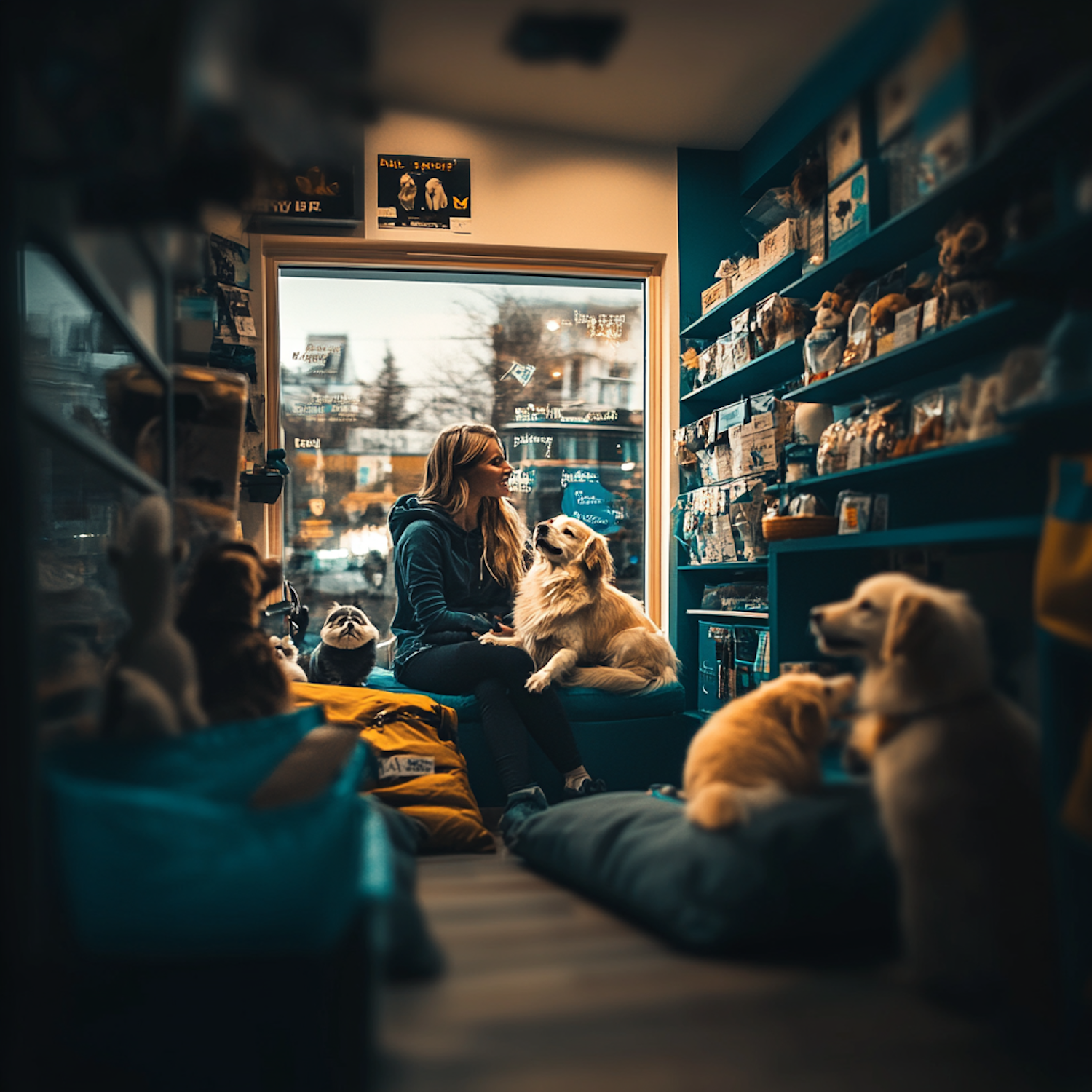A woman in a pet store surrounded by dogs, sitting on a bench with pet supplies around. Warm lighting and a cozy atmosphere.