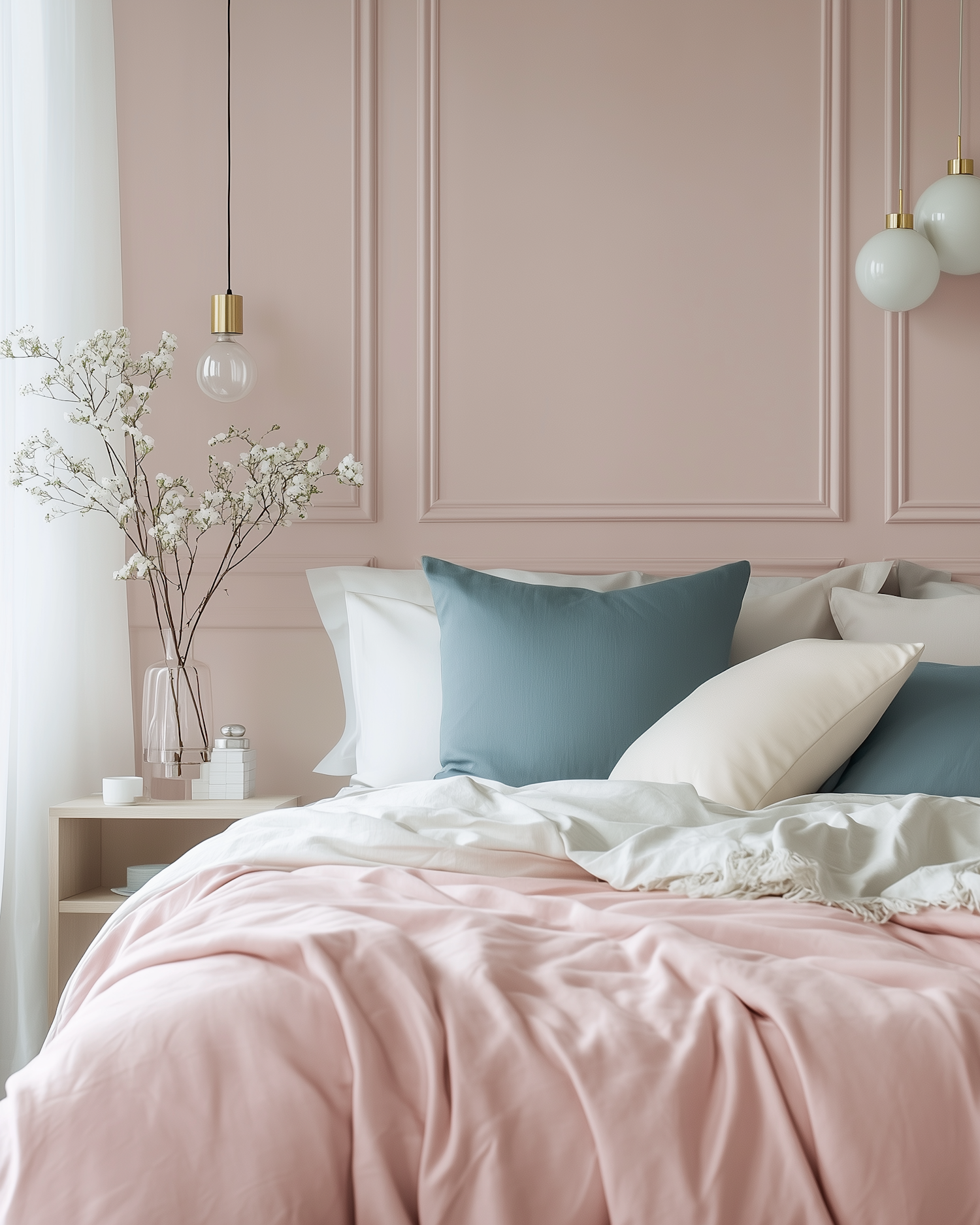 Soft pink bedroom with pastel bedding, gold-accented pendant lights, and delicate white flowers in a vase for a cozy, elegant vibe.
