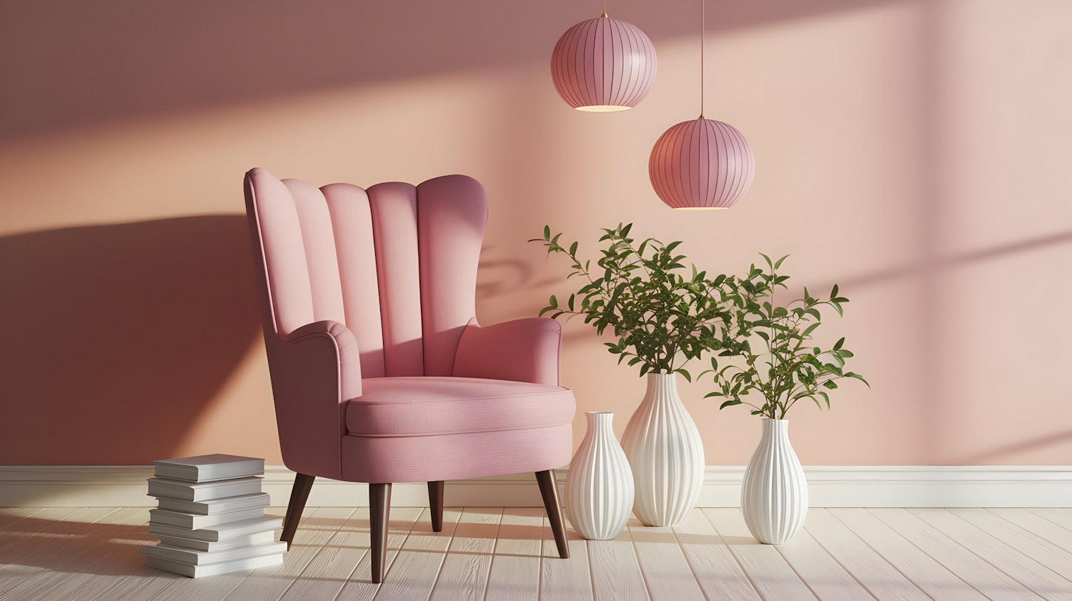 Chic pink armchair with pendant lights, white vases, and green plants in a pastel pink room. Perfect cozy corner for relaxation.