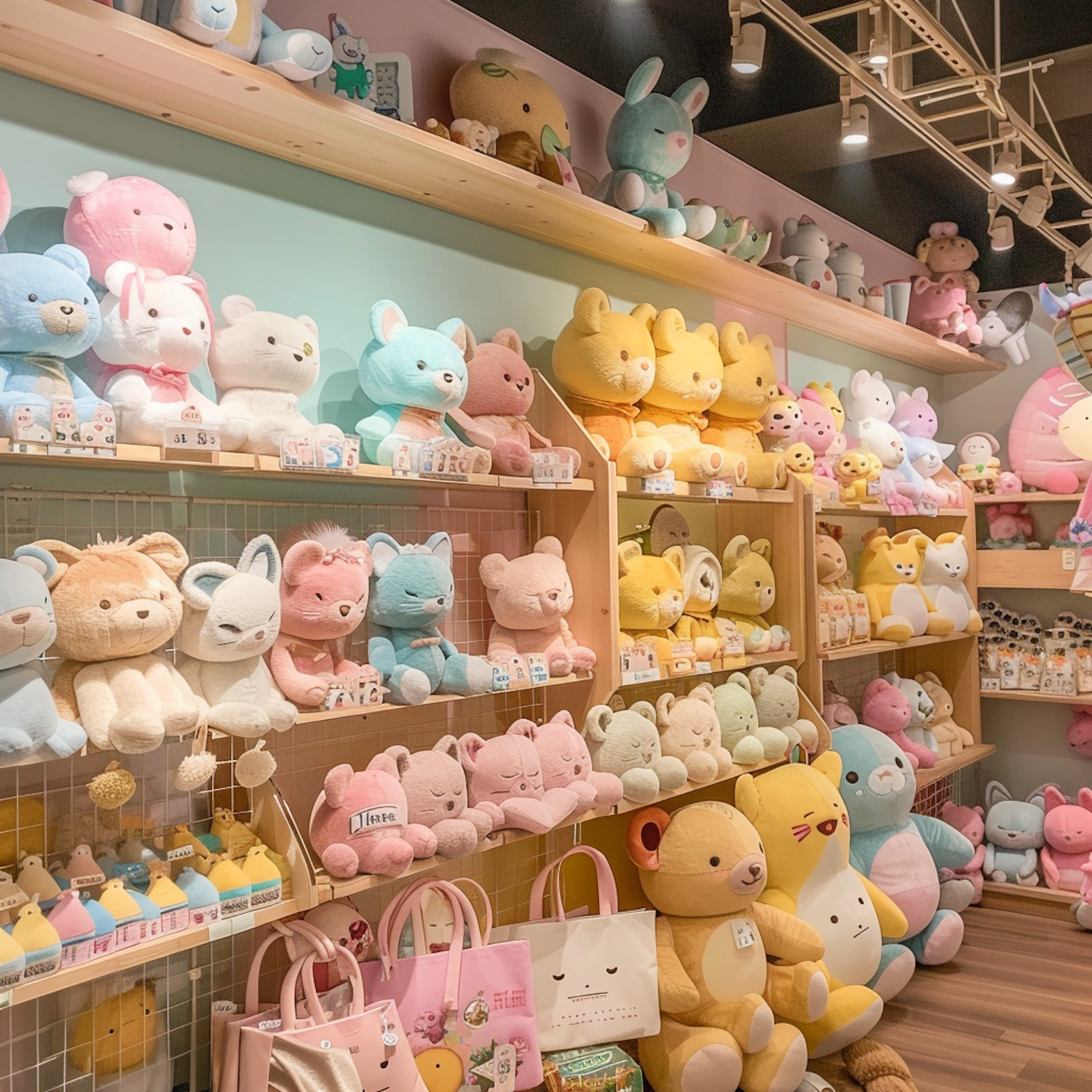 Explore a vibrant toy store filled with pastel-colored plush toys and cute bags, creating a playful and inviting atmosphere.