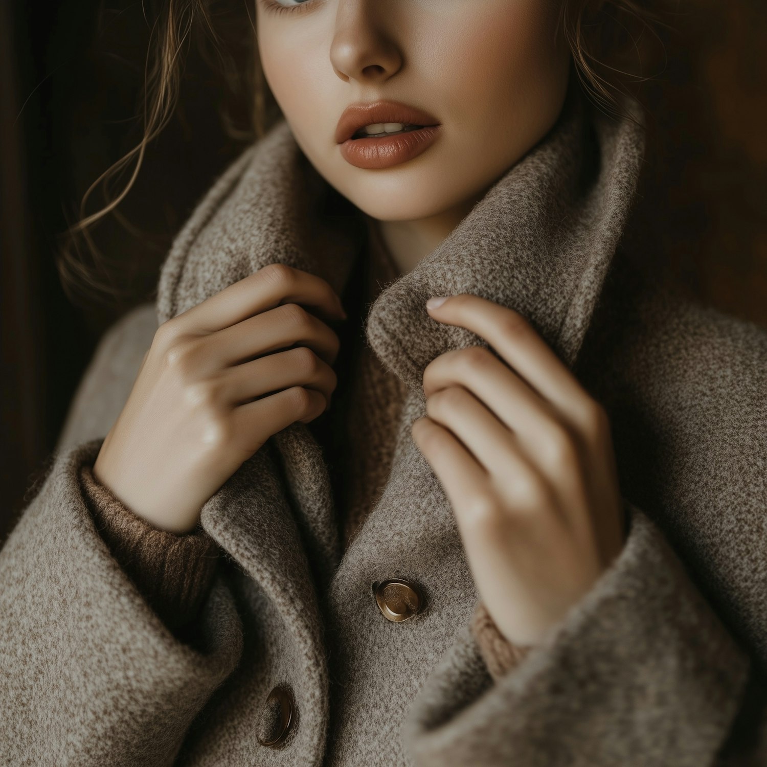 Close-up of a woman adjusting a beige wool coat collar, with soft lighting and a cozy, intimate vibe.