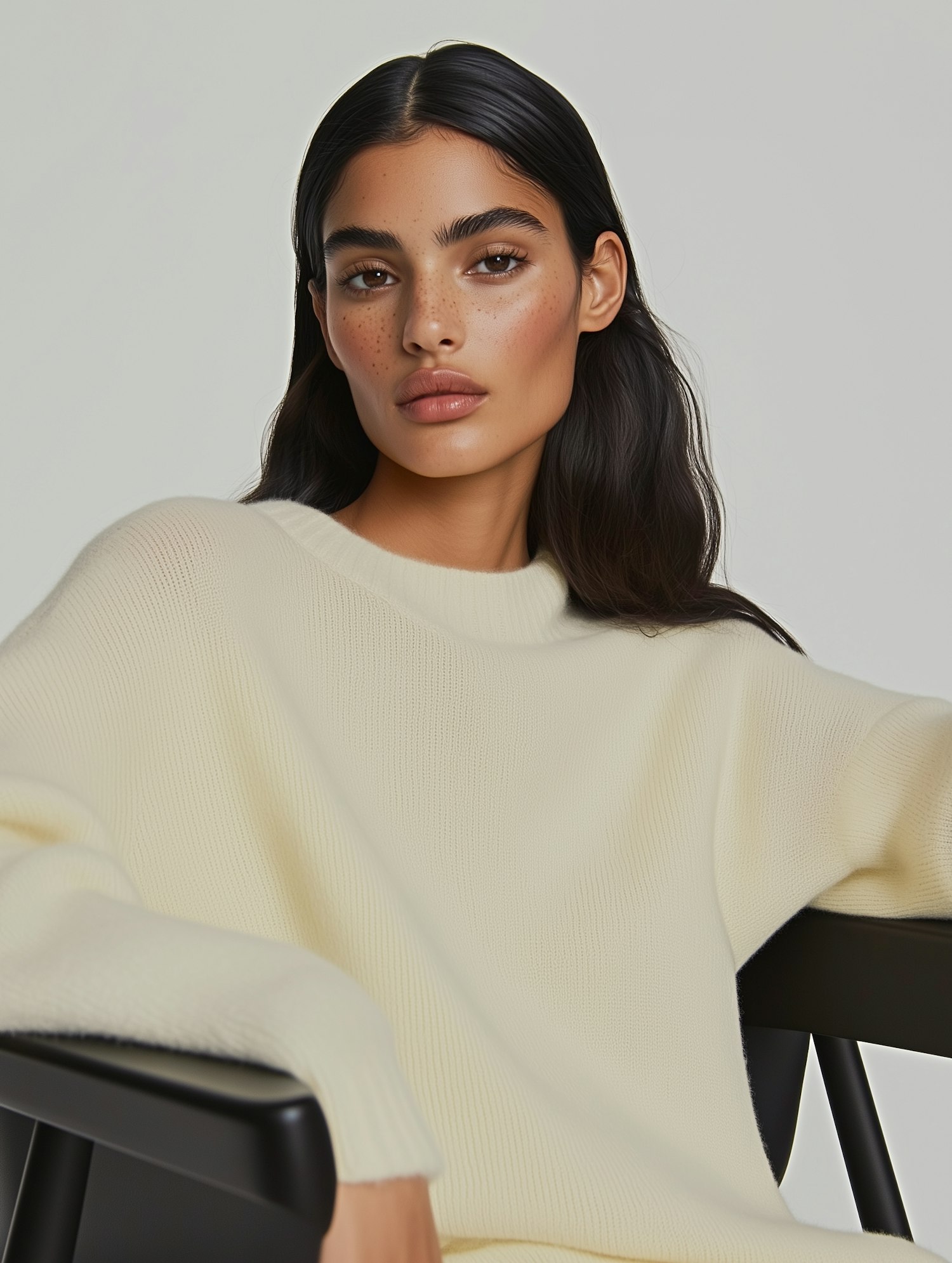A serene portrait of a woman with natural freckles, sleek black hair, and a cozy cream sweater, exuding minimalist elegance.