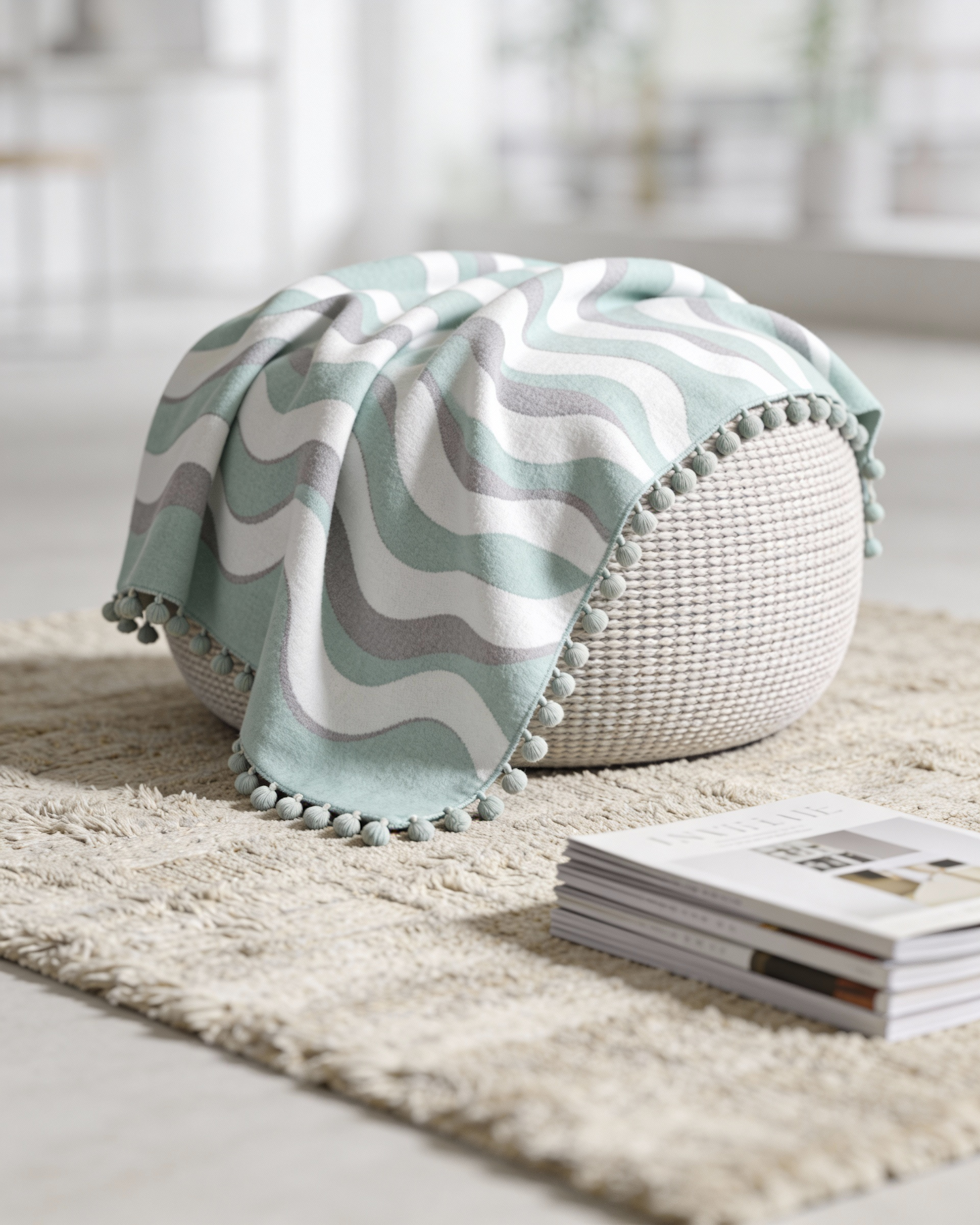 A soft mint blanket with abstract wave patterns in white and pale gray is casually draped across a round woven ottoman. The fringe is replaced with tiny knotted tassels. The setting includes a textured rug and a stack of design magazines, giving it a relaxed, contemporary feel.