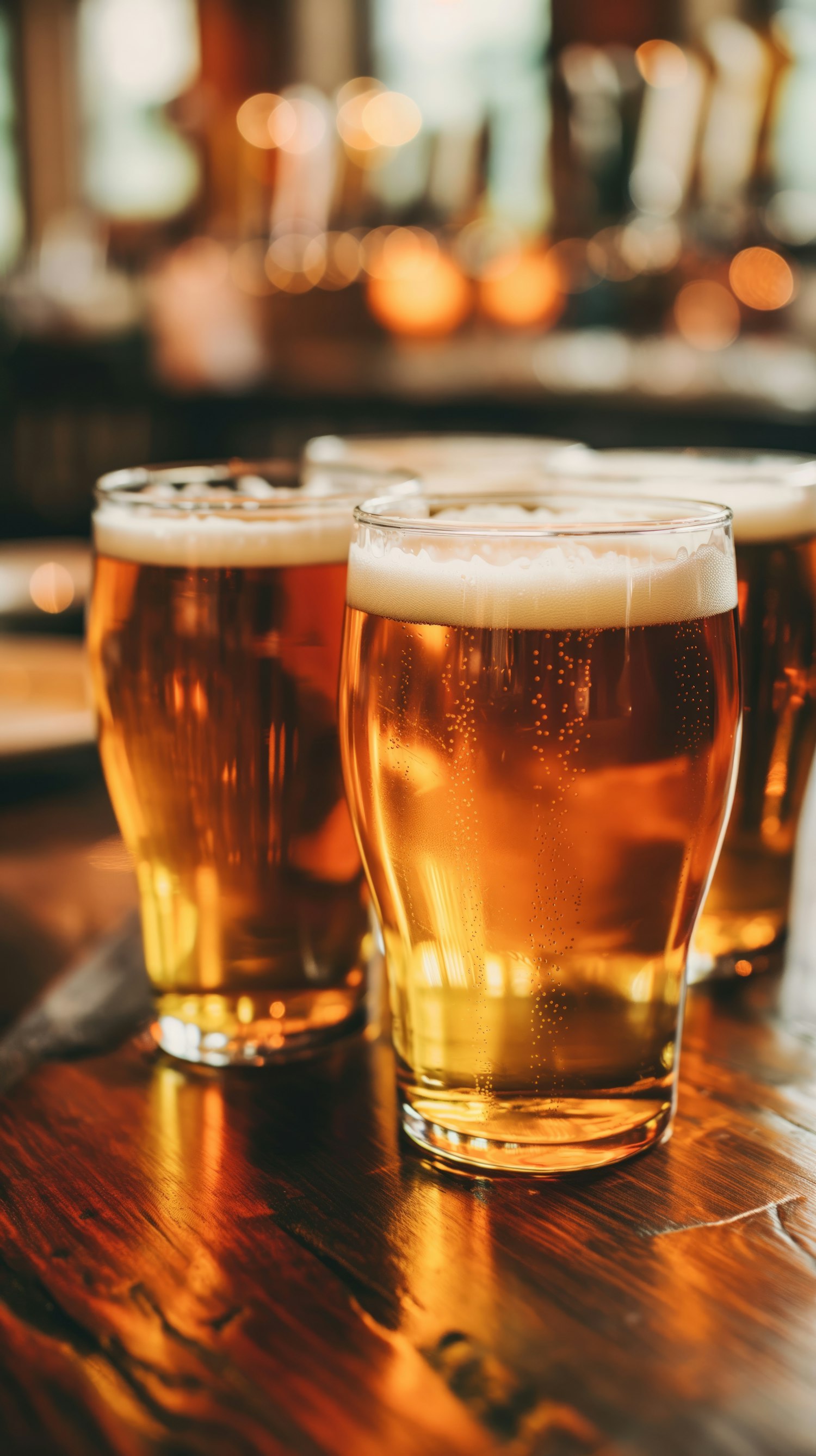 Close-up of frothy amber beer in pint glasses on a wooden table with warm, inviting lighting in the background.
