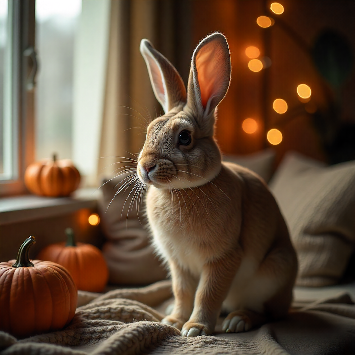 A cute rabbit sits on a blanket surrounded by pumpkins and fairy lights, creating a cozy autumn vibe.