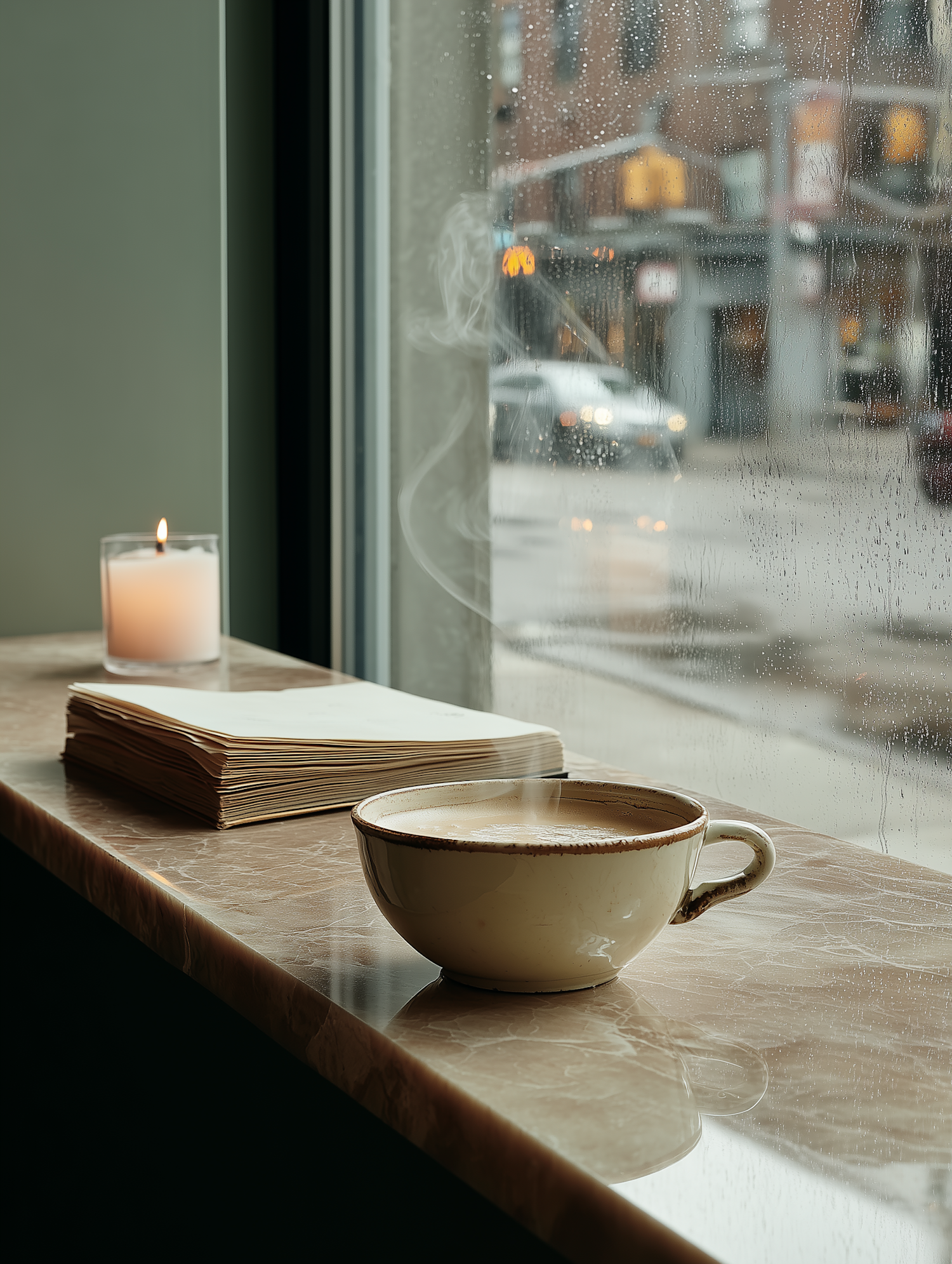 A steaming coffee cup, a lit candle, and papers on a marble windowsill with a rainy city street view in the background.