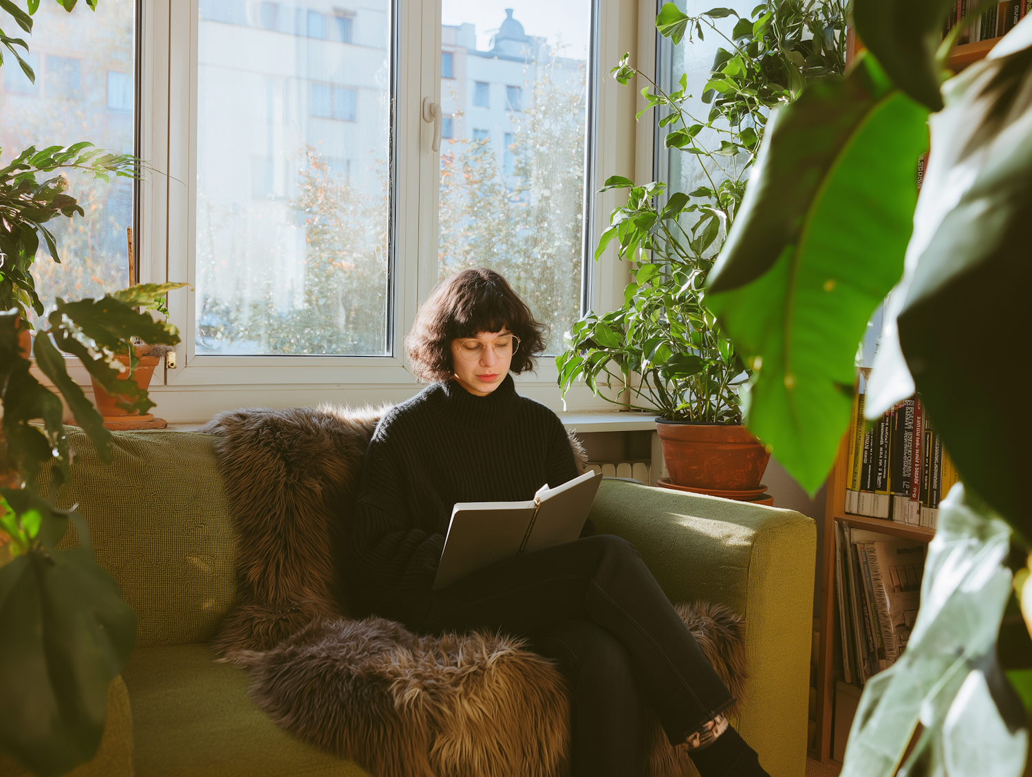 A cozy reading nook with a person enjoying a book, surrounded by lush plants and warm sunlight streaming through a large window.