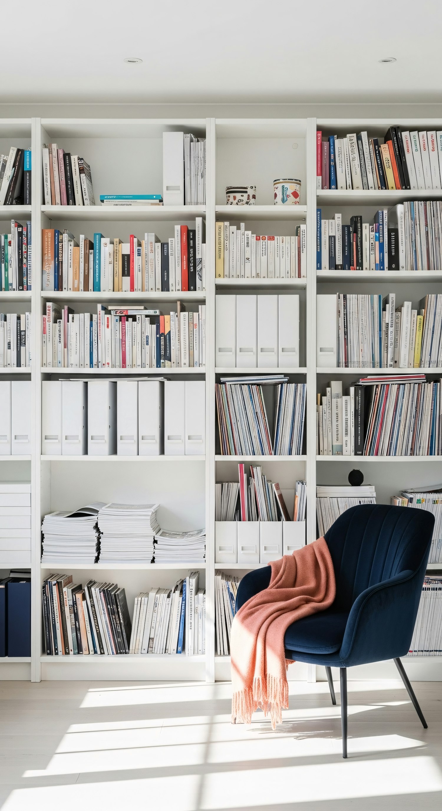 Bright and cozy reading nook with a navy chair, pink throw, and a neatly organized white bookshelf filled with books and magazines.