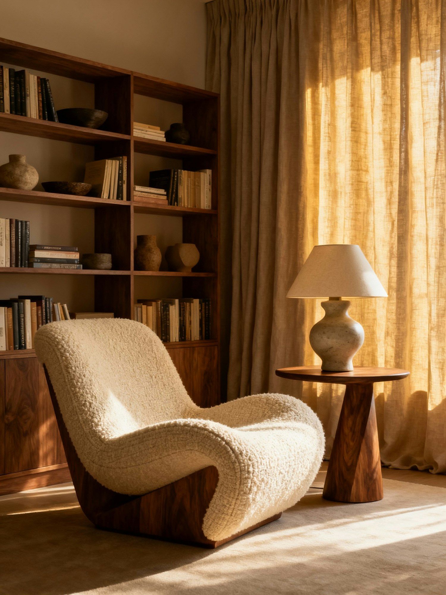 Professional interior design photography, warm and textured atmosphere, soft natural lighting, retro-modern aesthetic, mid-century inspired furniture, crafted wooden details, neutral tones with accents of earthy colors, editorial style, timeless and sophisticated mood. A cozy reading corner featuring an organic-shaped lounge chair in cream boucle, paired with a sleek wooden side table holding a ceramic lamp. A minimalist bookshelf in walnut wood is filled with carefully curated books and objects. The setting is surrounded by soft draped curtains, with warm light creating a timeless and intimate mood.