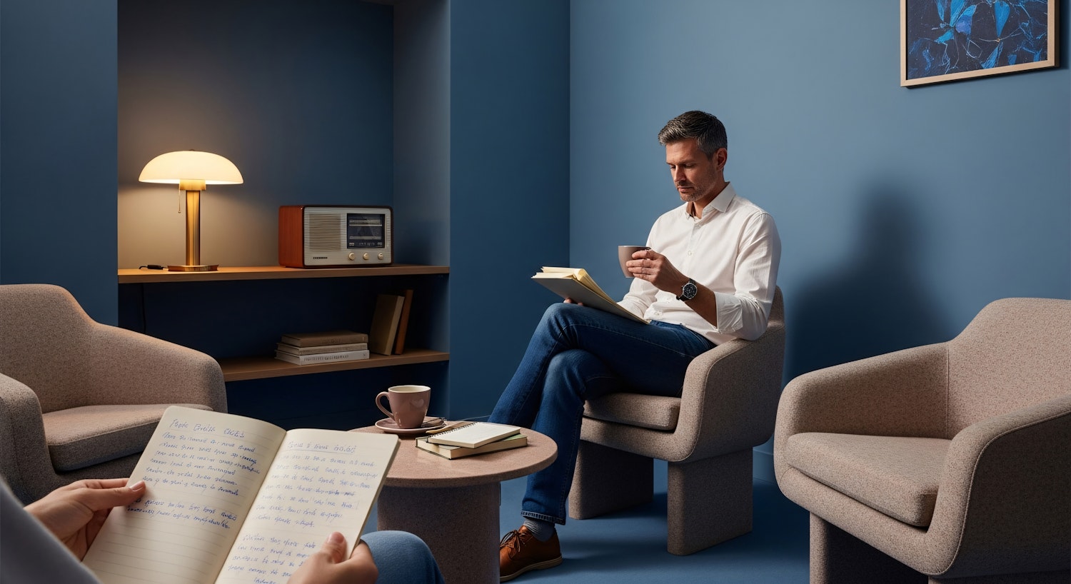 A serene reading space with modern furniture, a vintage radio, and a man enjoying a book and coffee in a cozy, blue-walled room.