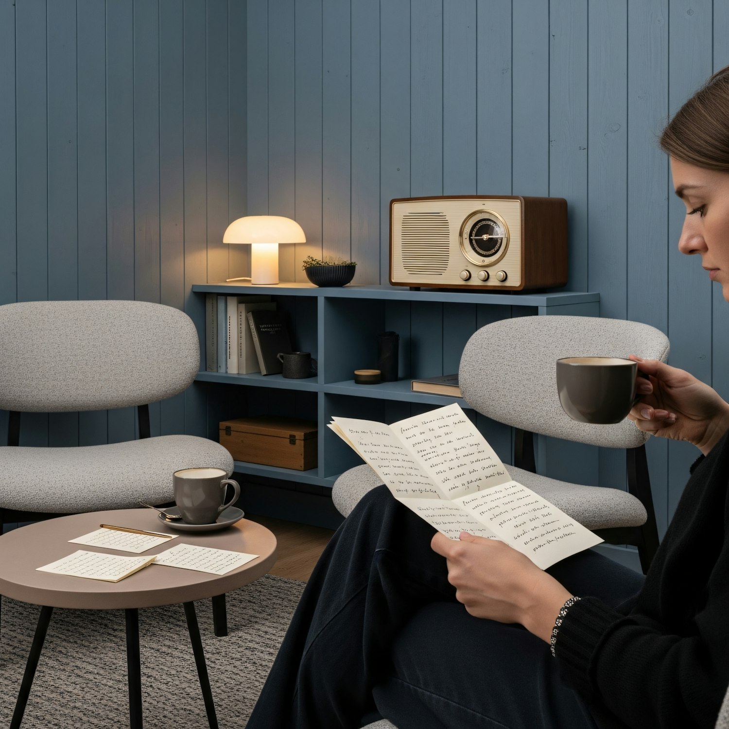 A cozy room with a woman reading a letter, sipping coffee, and surrounded by warm decor, including a vintage radio and soft lighting.