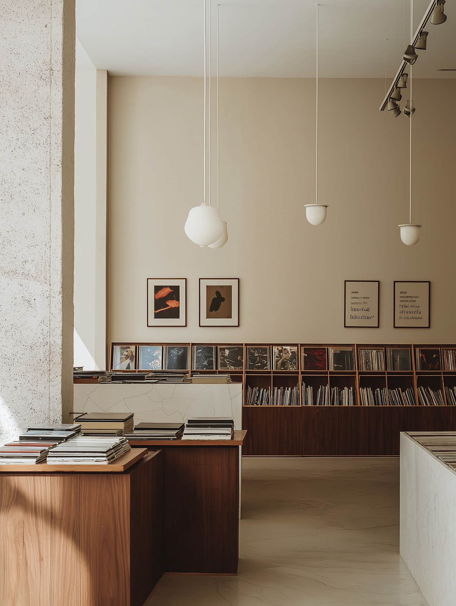 Minimalist record store with warm lighting, wooden shelves, vinyl records, and modern pendant lights for a cozy, elegant vibe.