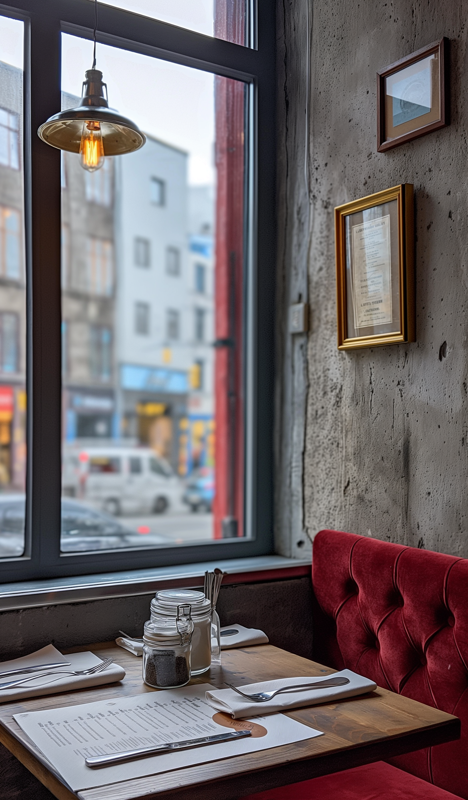 Cozy restaurant table with red velvet seating, set for two by a large window. Vintage pendant light and rustic decor create a warm ambiance.