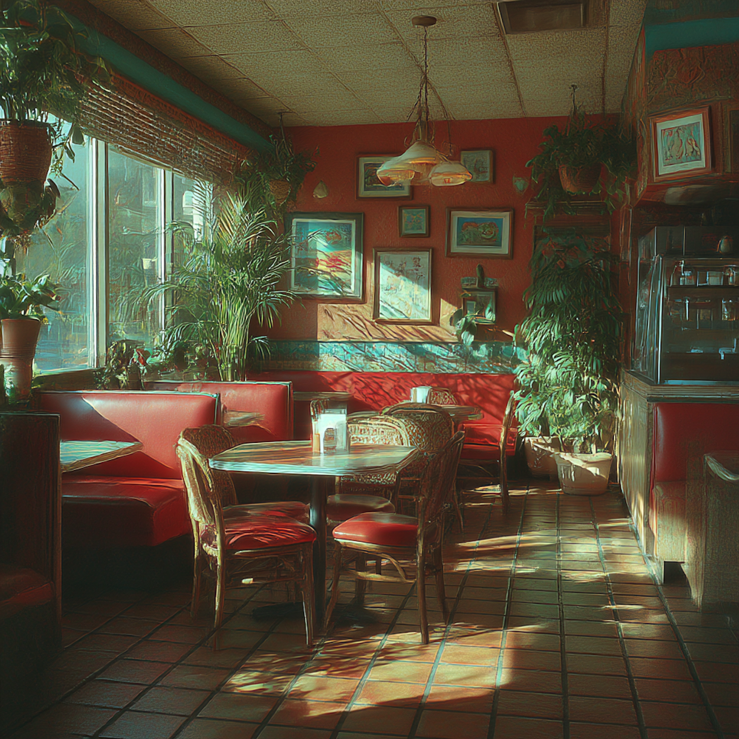 A cozy restaurant with red booths, wooden chairs, and vibrant plants, bathed in warm sunlight through large windows.