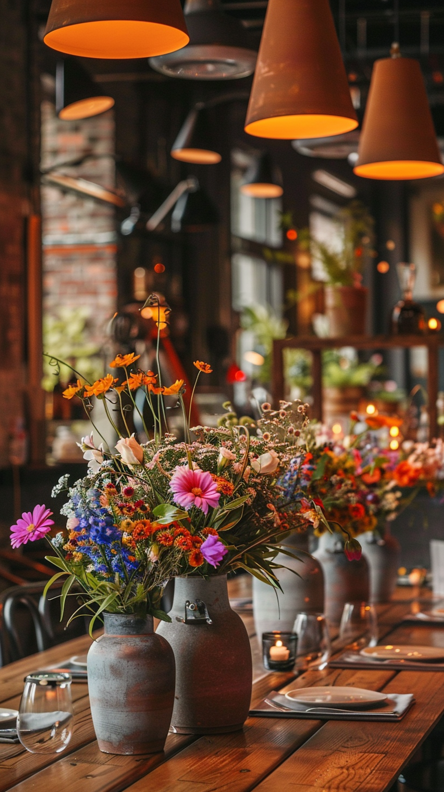 Rustic dining table with vibrant floral centerpieces, warm lighting, and elegant table settings in a cozy restaurant ambiance.
