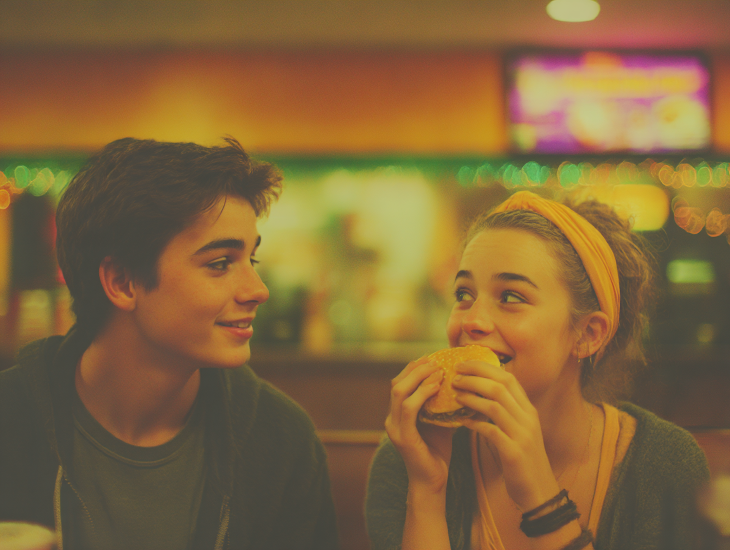 Two friends share a joyful moment in a cozy restaurant, with warm lighting and colorful decor enhancing the scene.