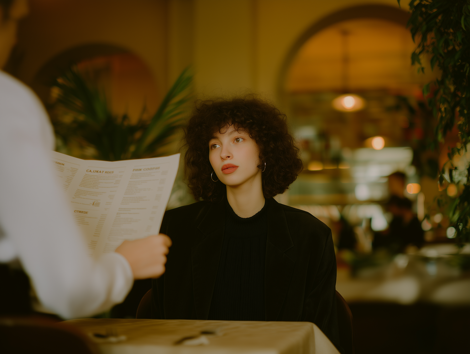 A person with curly hair sits at a restaurant table, looking at a menu in a cozy, warmly lit setting with plants and soft lighting.