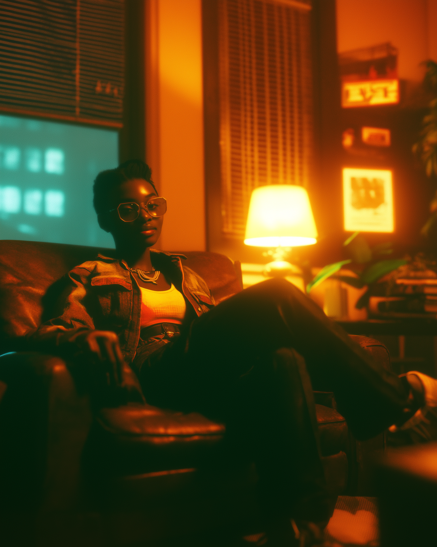 A stylish woman in a cozy, retro-lit room, sitting in a leather chair with warm lighting and vintage decor.