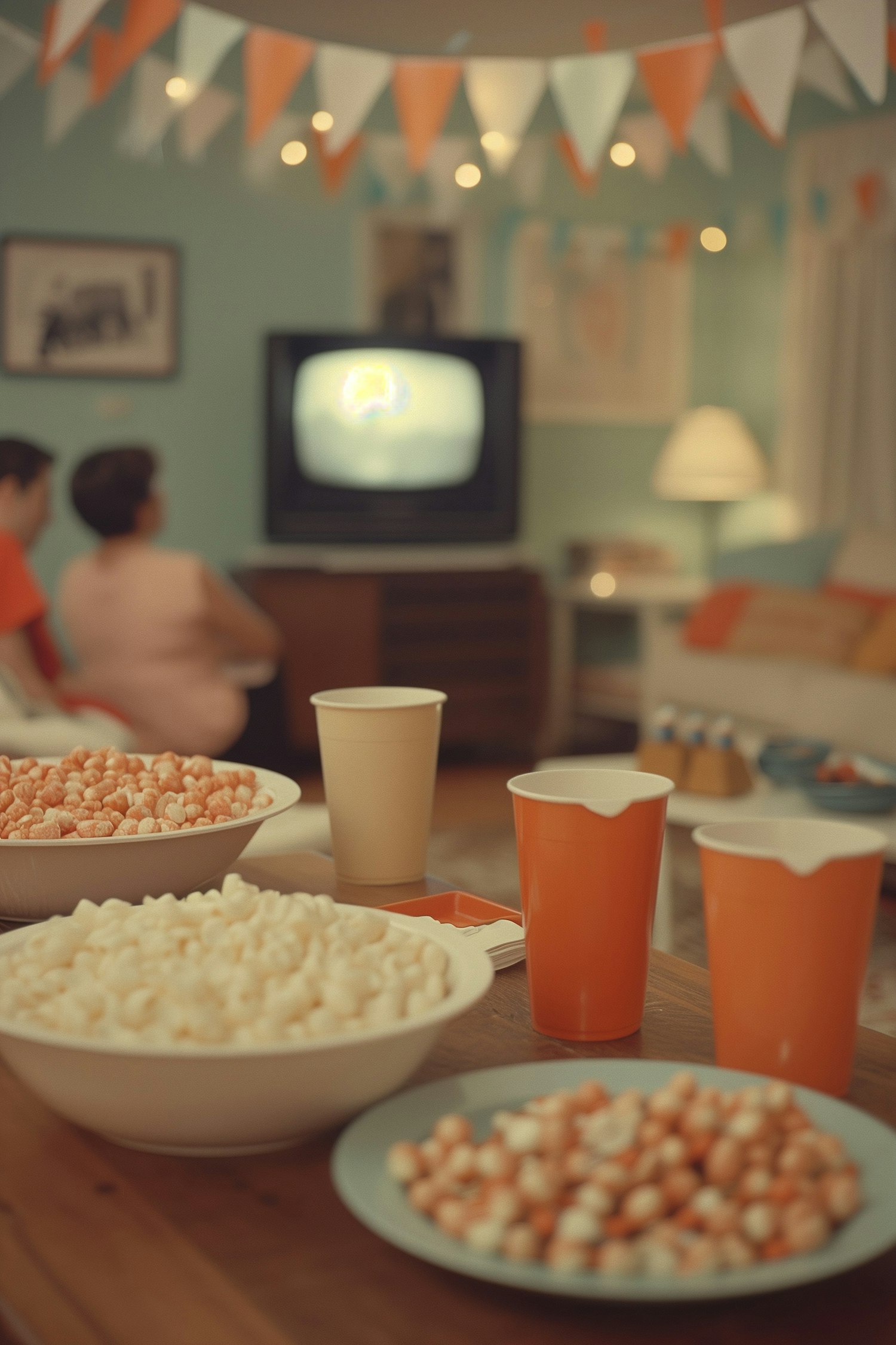Cozy living room with snacks and drinks, vintage TV, and festive bunting. Warm lighting creates a nostalgic, inviting atmosphere.