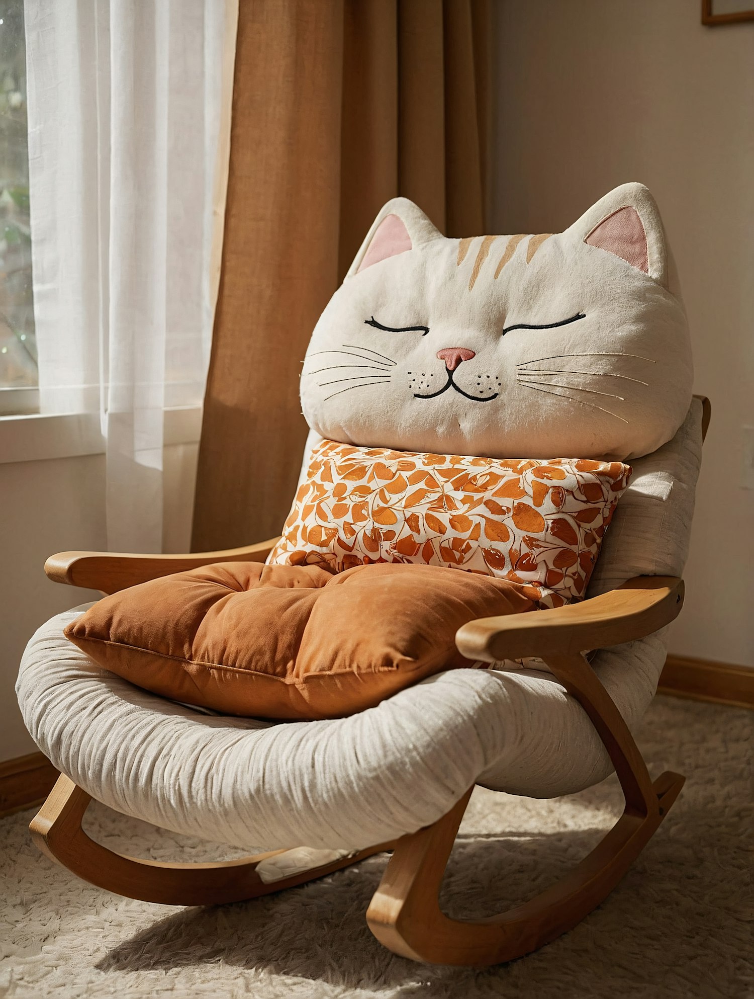 Adorable rocking chair with a cat-shaped pillow, orange cushions, and warm natural lighting, creating a cozy and playful vibe.