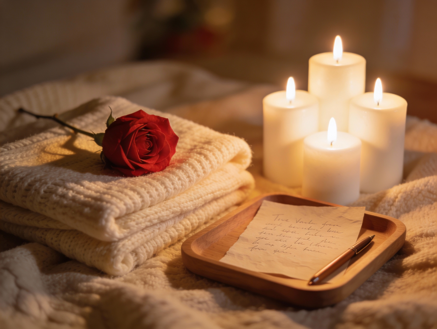 A red rose on folded blankets, a handwritten note with a pen, and glowing candles create a cozy and romantic atmosphere.