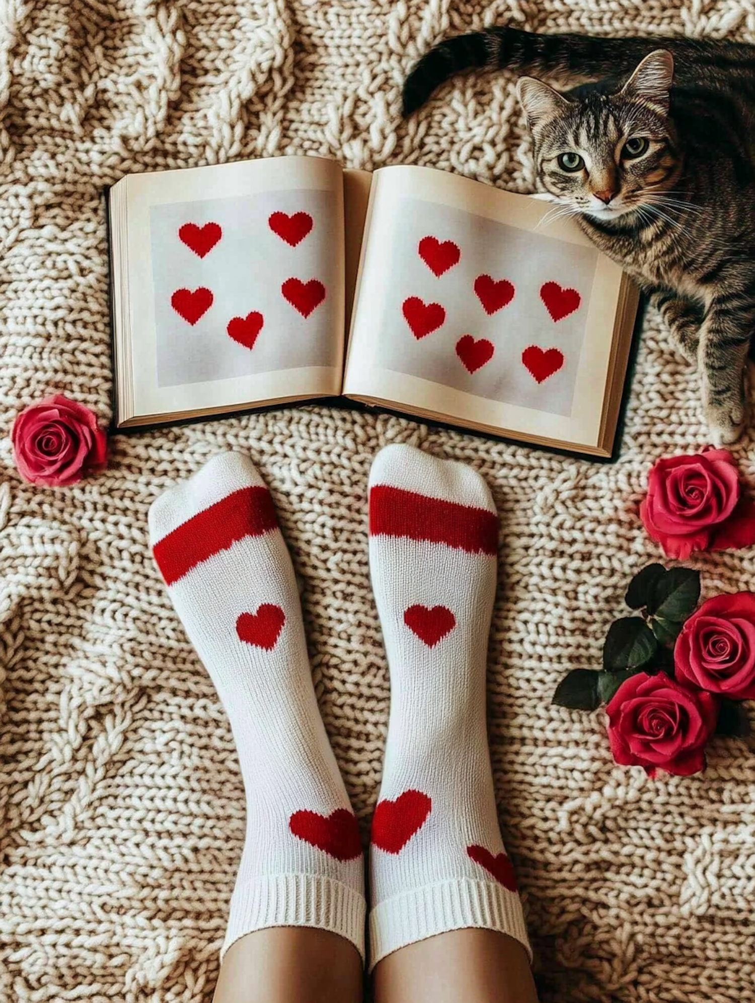 Cozy scene with heart socks, a tabby cat, and red roses on a knit blanket, evoking warmth and love.