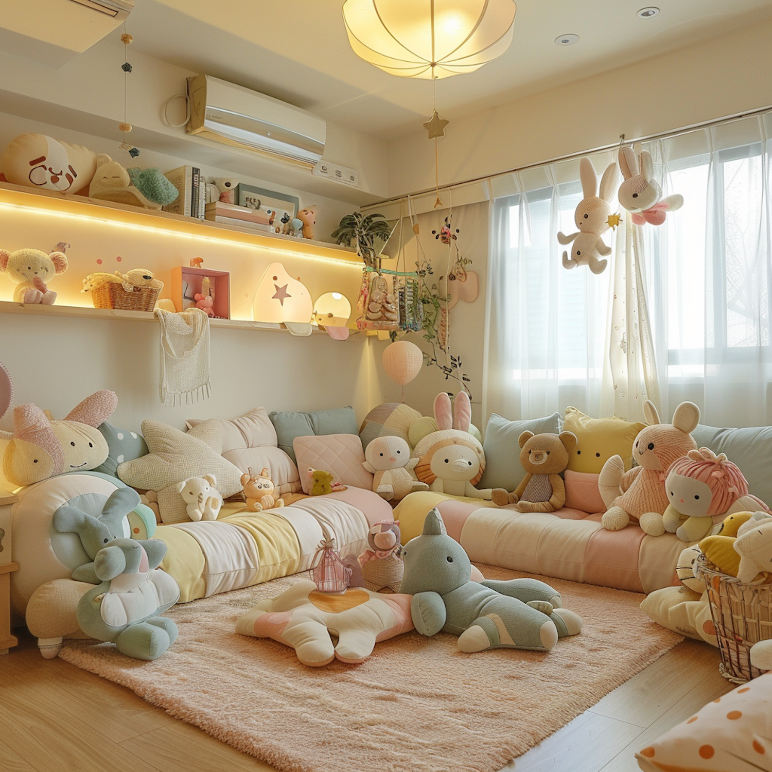 Charming children's room with plush toys, pastel colors, and cozy decor, creating a warm and inviting atmosphere.