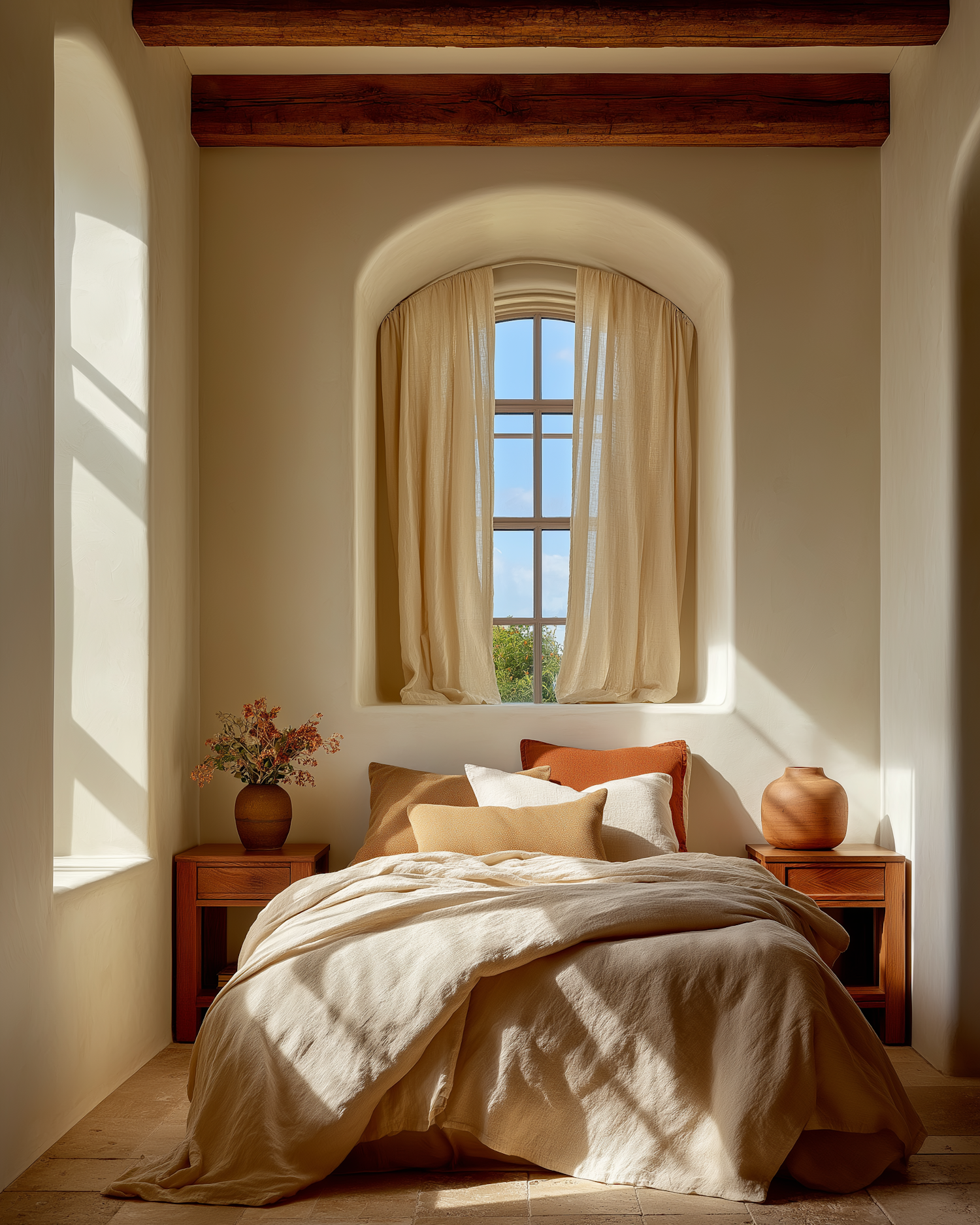 Cozy bedroom with rustic charm, featuring a sunlit arched window, neutral linens, wooden beams, and elegant decor for a serene ambiance.