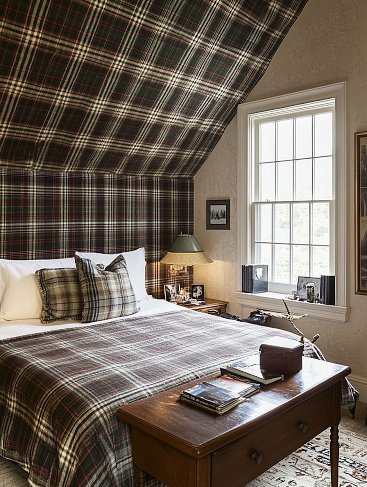 Cozy bedroom with plaid walls and bedding, a wooden desk, and natural light from a window. Perfect for a rustic, traditional vibe.