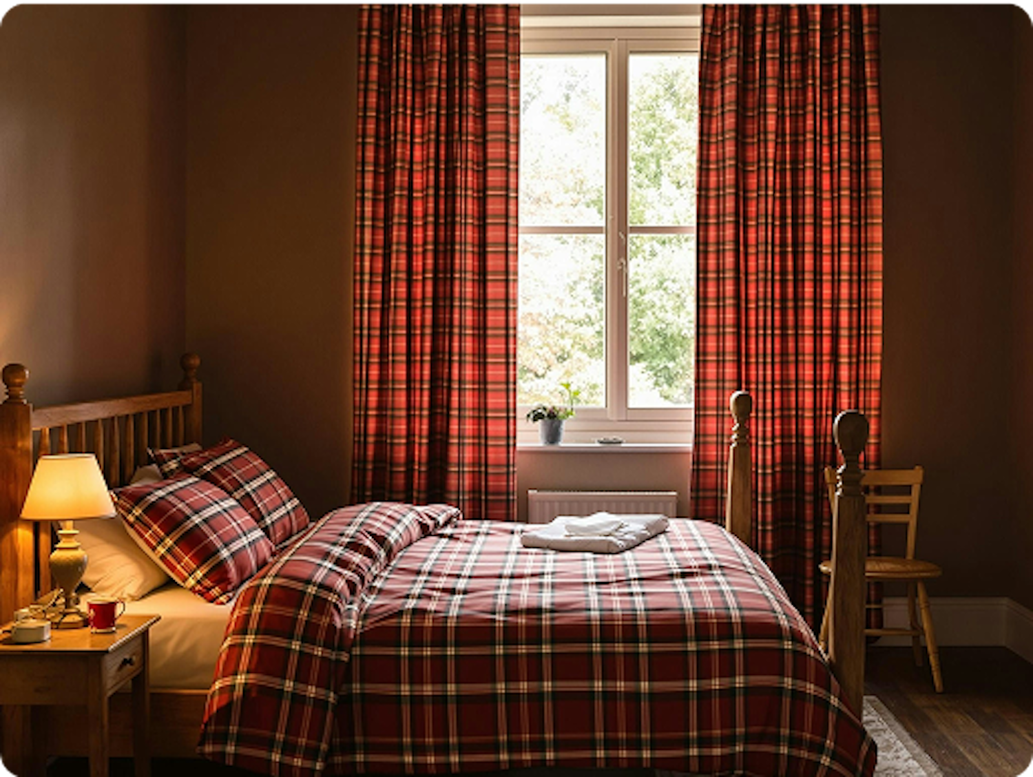 Cozy bedroom with red plaid bedding, matching curtains, and warm lighting. Rustic wooden furniture adds charm to the inviting space.