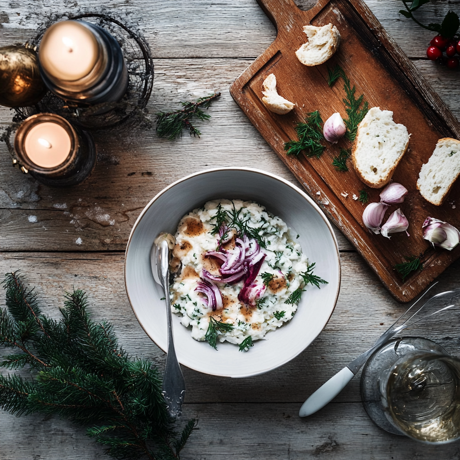 Cozy dining scene with creamy risotto, crusty bread, garlic, and candles on a rustic table. Perfect for a winter meal.