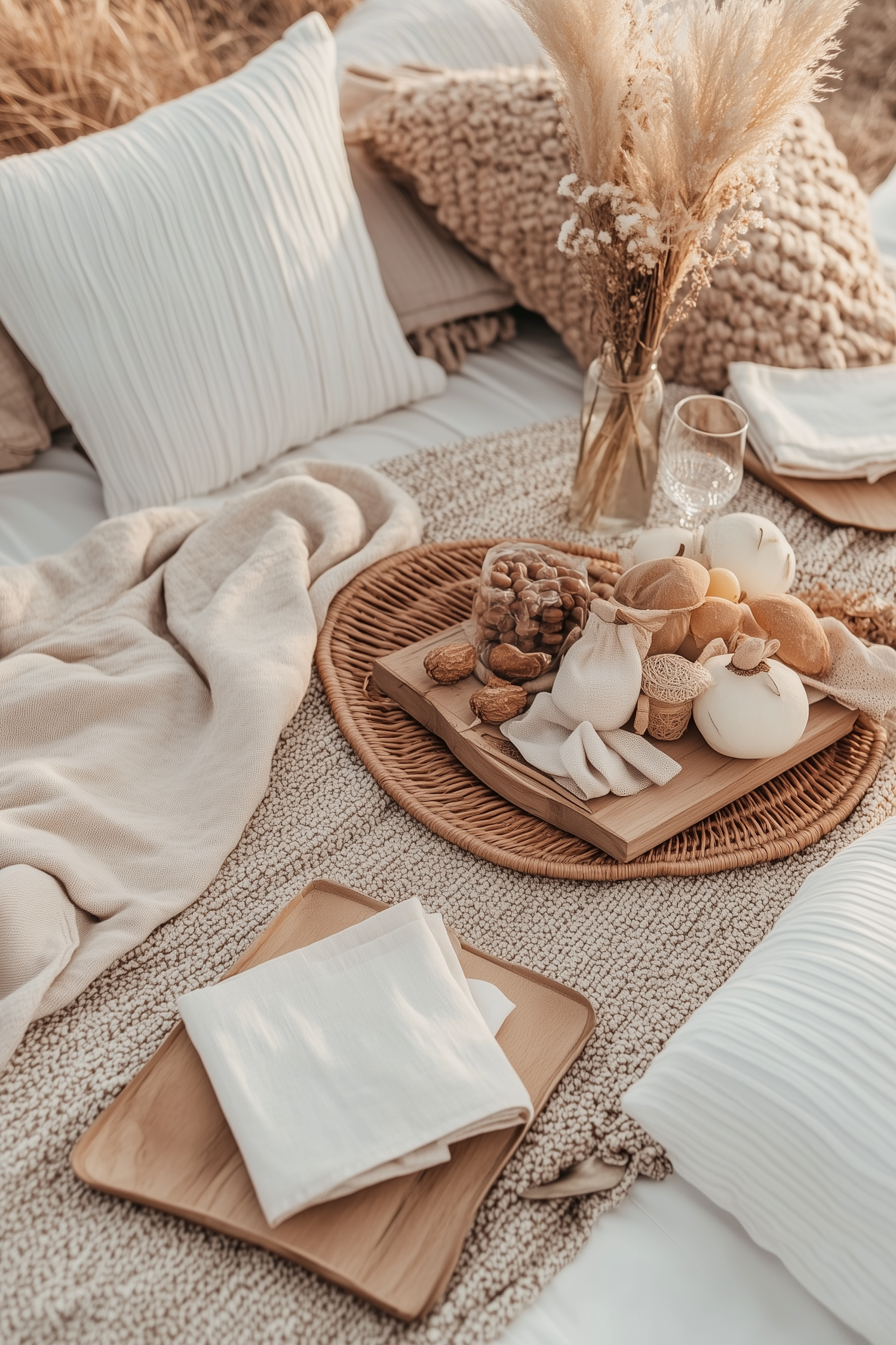 Cozy picnic setup with neutral tones, featuring pillows, snacks, and pampas grass for a warm, inviting outdoor ambiance.