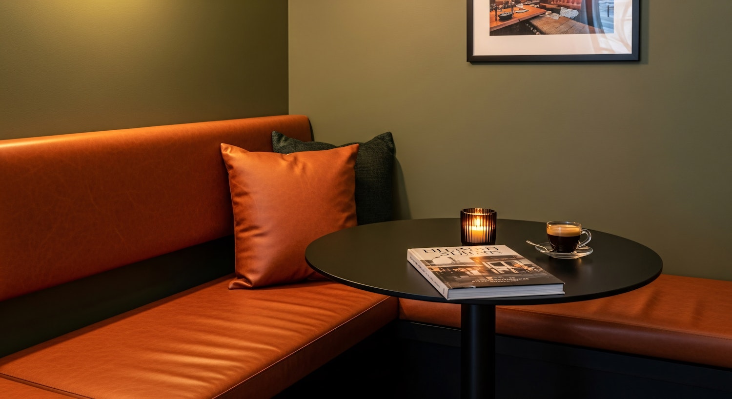 Cozy seating area with a leather bench, black table, espresso, candle, and muted green walls for a warm, inviting ambiance.