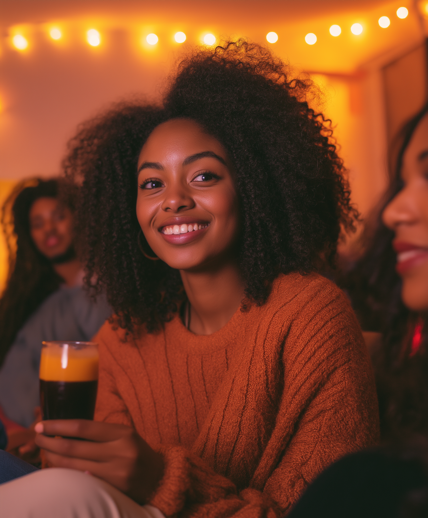 Smiling woman in a cozy setting with warm lighting, holding a drink. Festive string lights create a relaxed, social atmosphere.