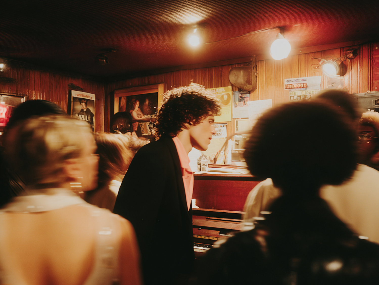 A warm, vintage-style indoor scene with people socializing, featuring a central figure in a black jacket and pink shirt near a piano.