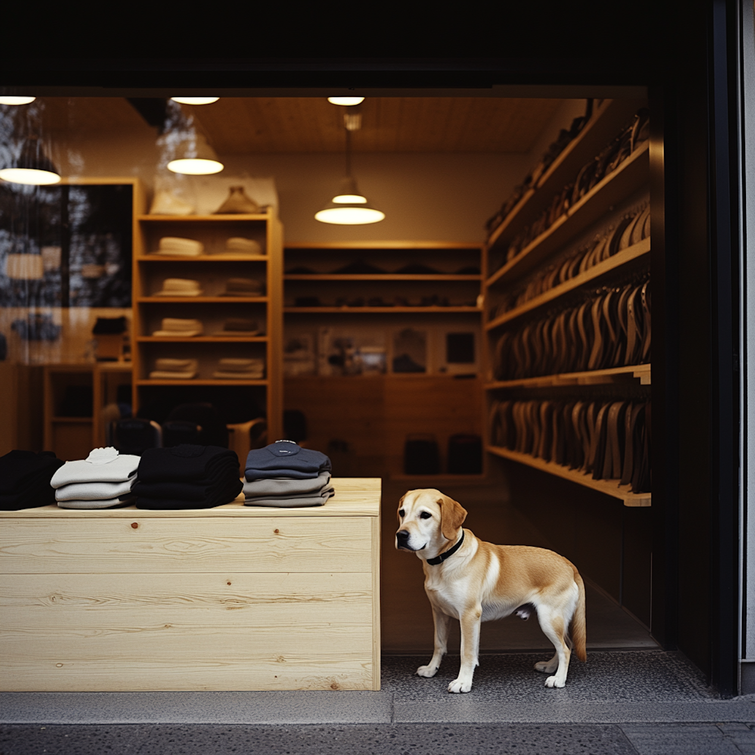 A golden Labrador stands at a cozy store entrance with neatly arranged shelves and folded sweaters, creating a warm, inviting atmosphere.