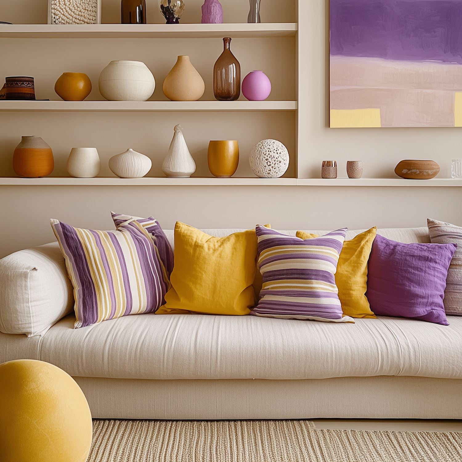 Cozy living room with a cream sofa, vibrant purple and yellow pillows, and decorative pottery on shelves. Warm, inviting atmosphere.