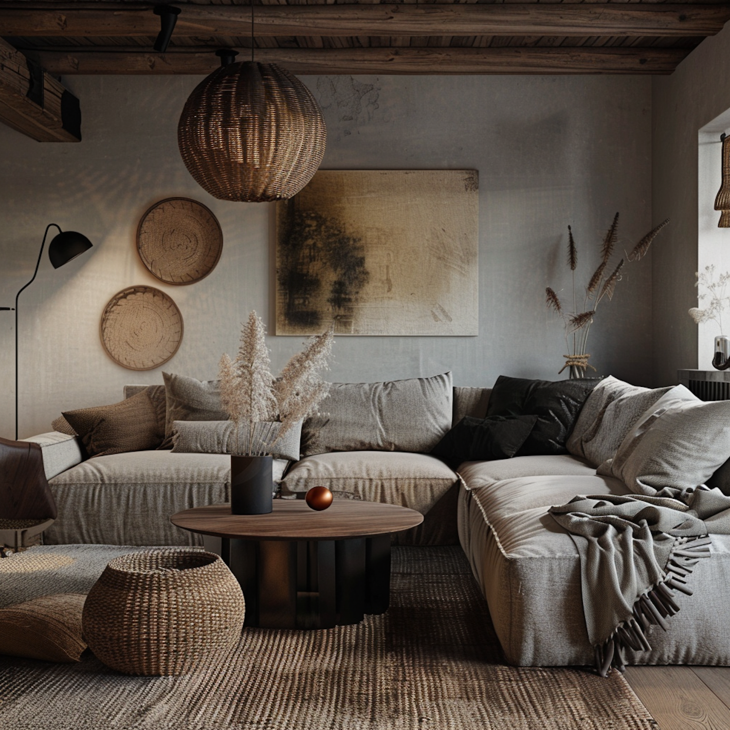 Cozy living room with a neutral palette, featuring a sectional sofa, woven decor, and warm lighting for a rustic charm.