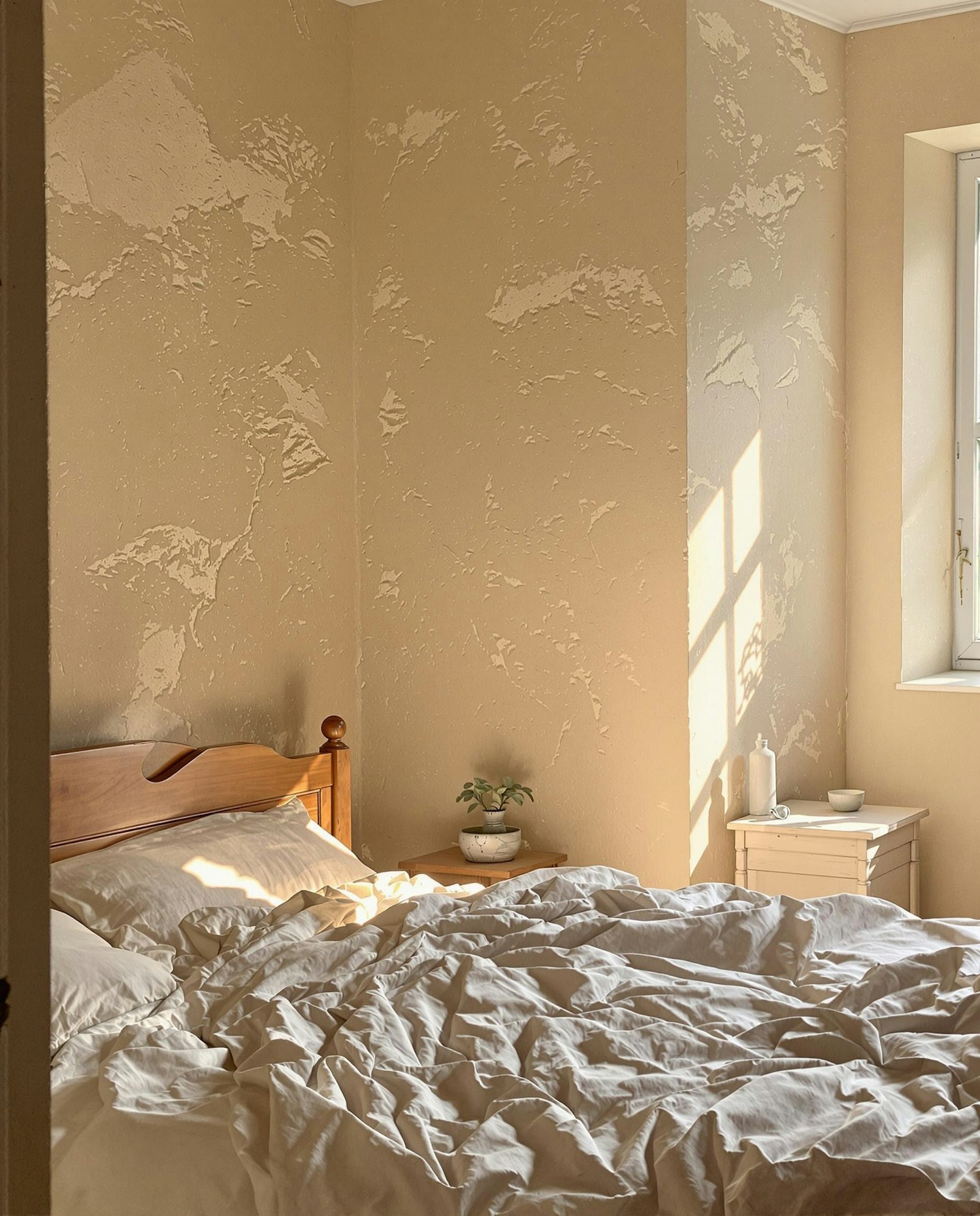 Bedroom with uneven plaster beige walls, crumpled linen sheets, and vintage wooden furniture. Soft daylight enhances imperfections and grain.