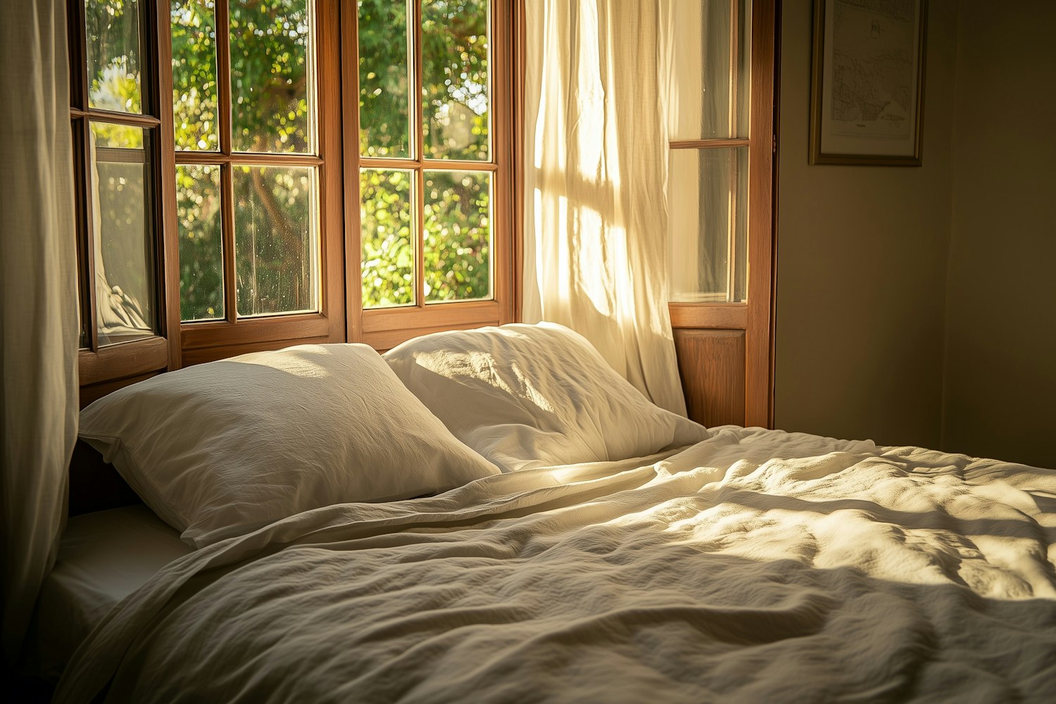 Cozy bedroom with sunlight streaming through wooden-framed windows, white linens, and a serene garden view. Perfect for a peaceful morning.