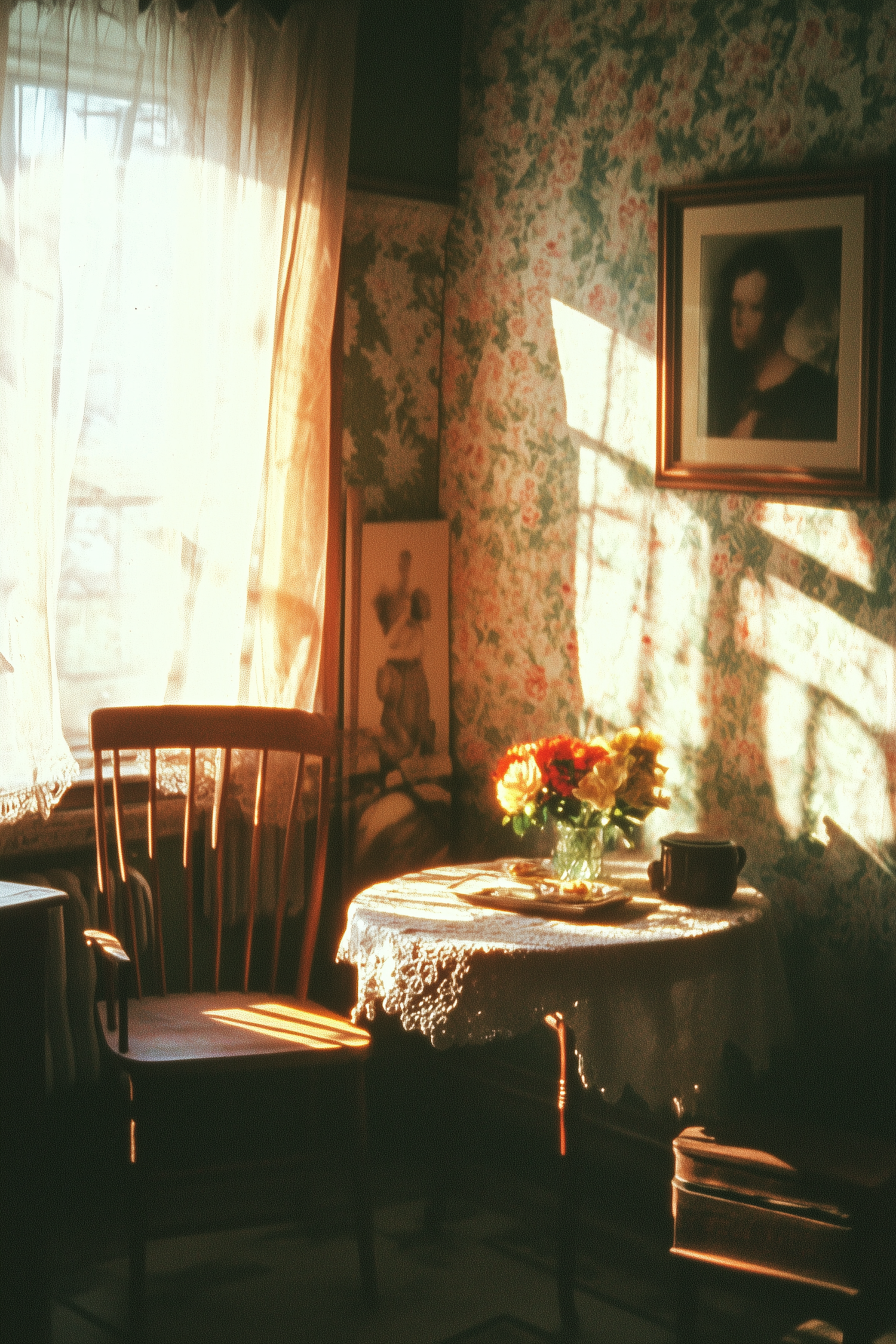 Sunlit vintage room corner with floral wallpaper, lace tablecloth, and vibrant flowers. Cozy and nostalgic ambiance.