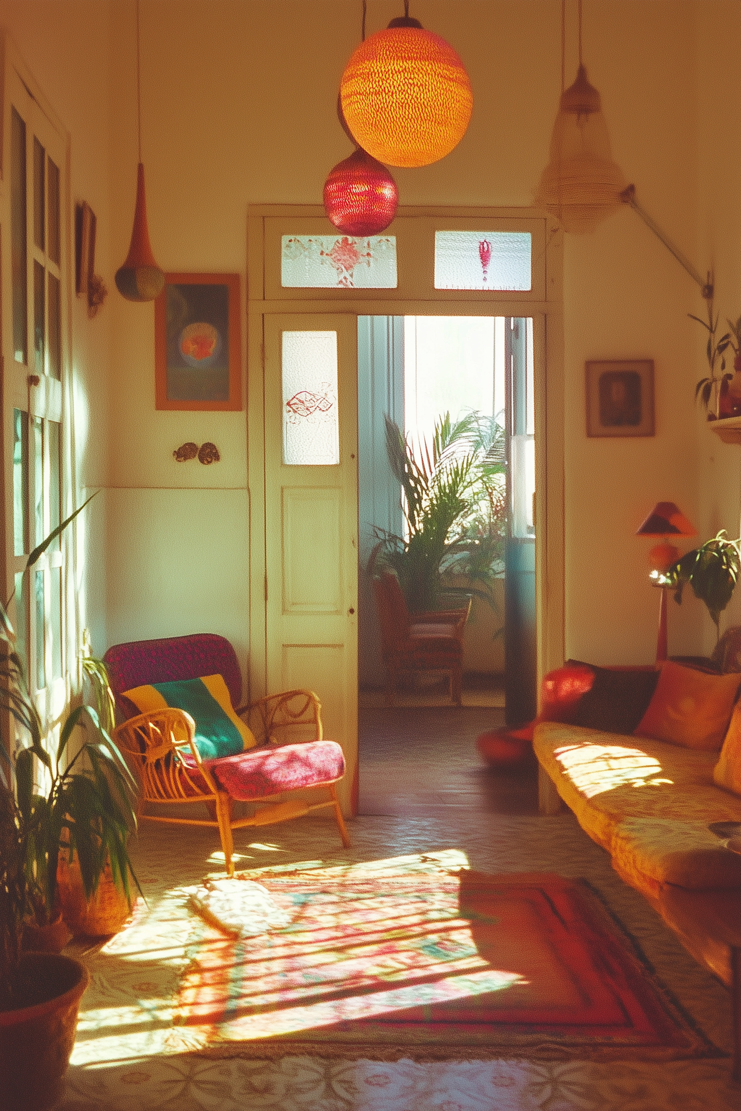 Sunlit bohemian living room with vintage decor, wicker chair, vibrant cushions, pendant lights, and lush plants creating a cozy atmosphere.