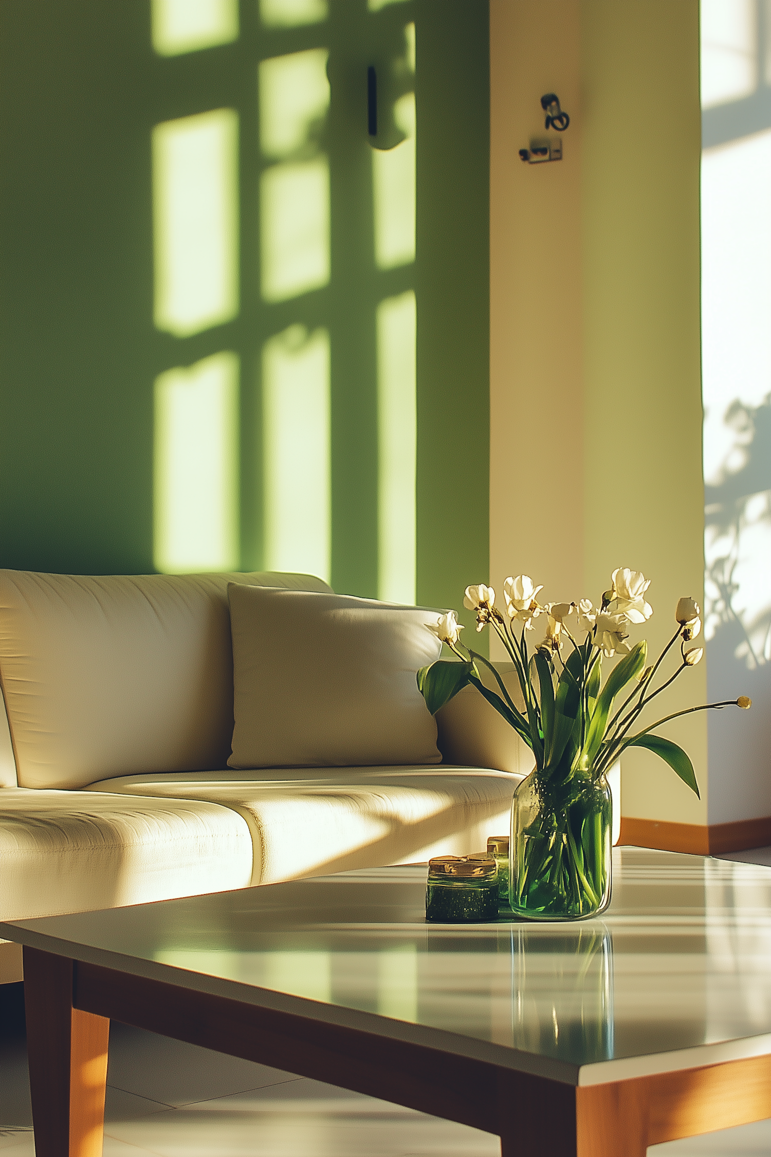 Sunlit living room with a beige sofa, green wall, and a glass vase of white flowers on a wooden coffee table. Warm and inviting decor.