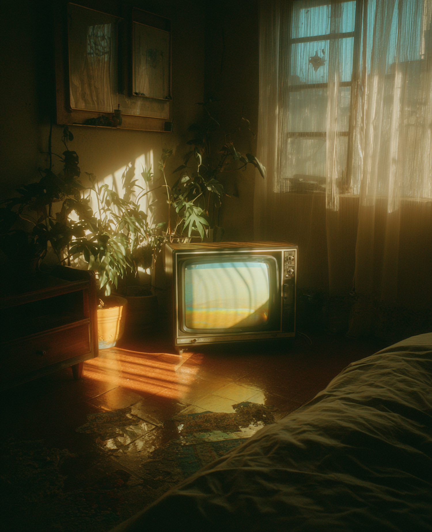 A vintage TV in a sunlit room with potted plants, sheer curtains, and warm tones creating a nostalgic and cozy atmosphere.