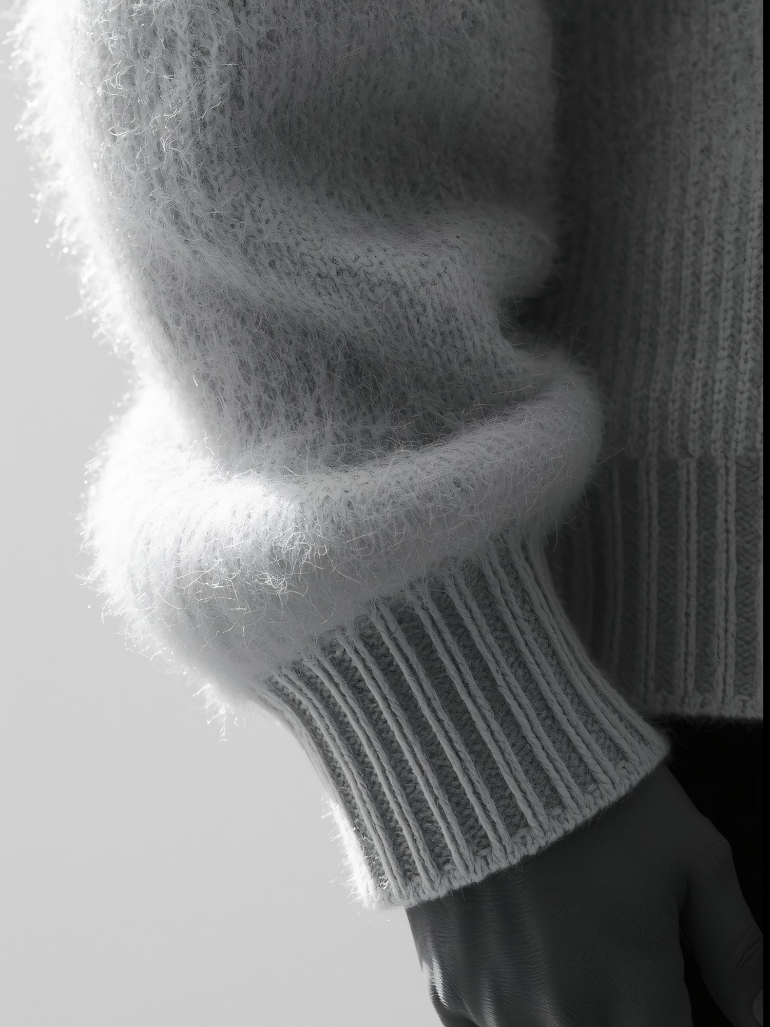 Close-up of a fluffy sweater's ribbed cuff and a hand, highlighting the soft texture and cozy design in a minimalistic setting.