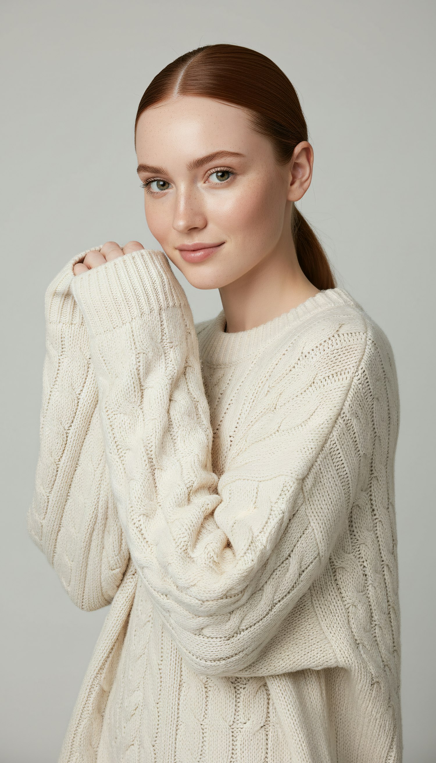 A young woman with red hair and a cream cable-knit sweater smiles gently against a neutral background, exuding warmth and comfort.