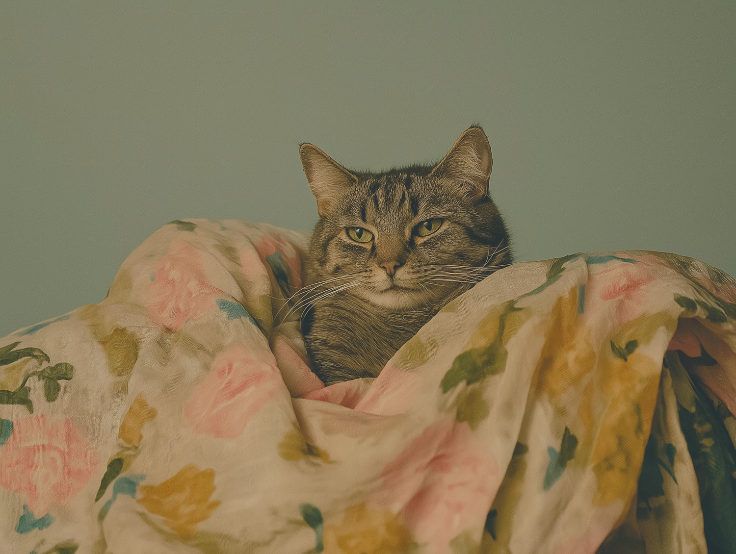 A relaxed tabby cat nestled in a colorful floral blanket against a muted green background, exuding coziness and tranquility.