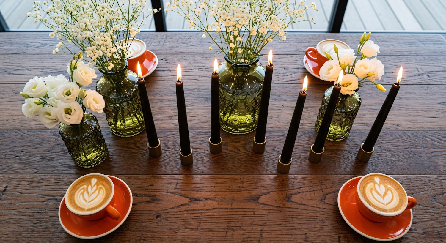 Elegant table setup with lattes, black candles, and green vases filled with white flowers on a wooden surface.