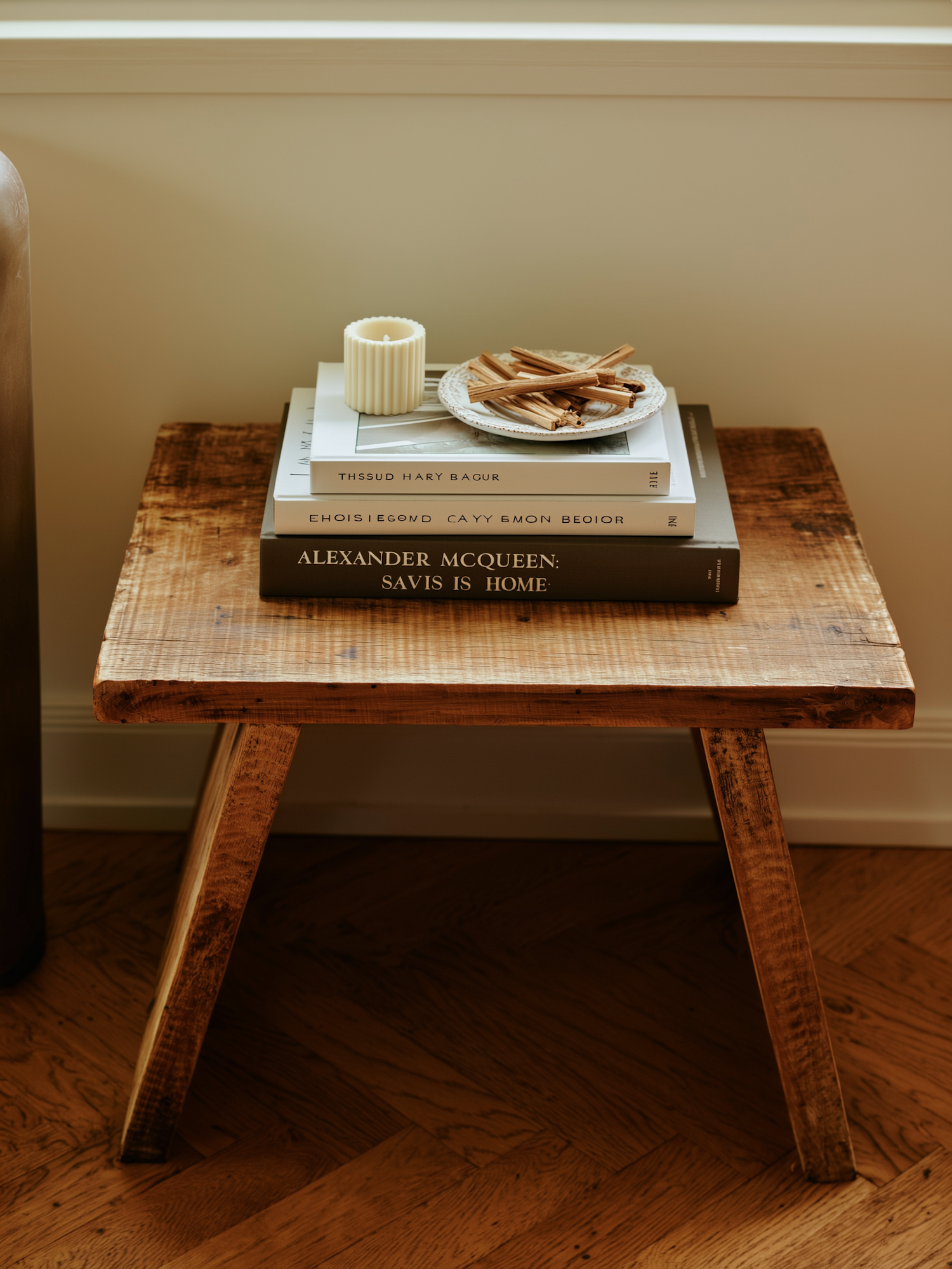 Rustic wooden table with books, a candle, and cinnamon sticks, creating a cozy and minimalist decor setup.