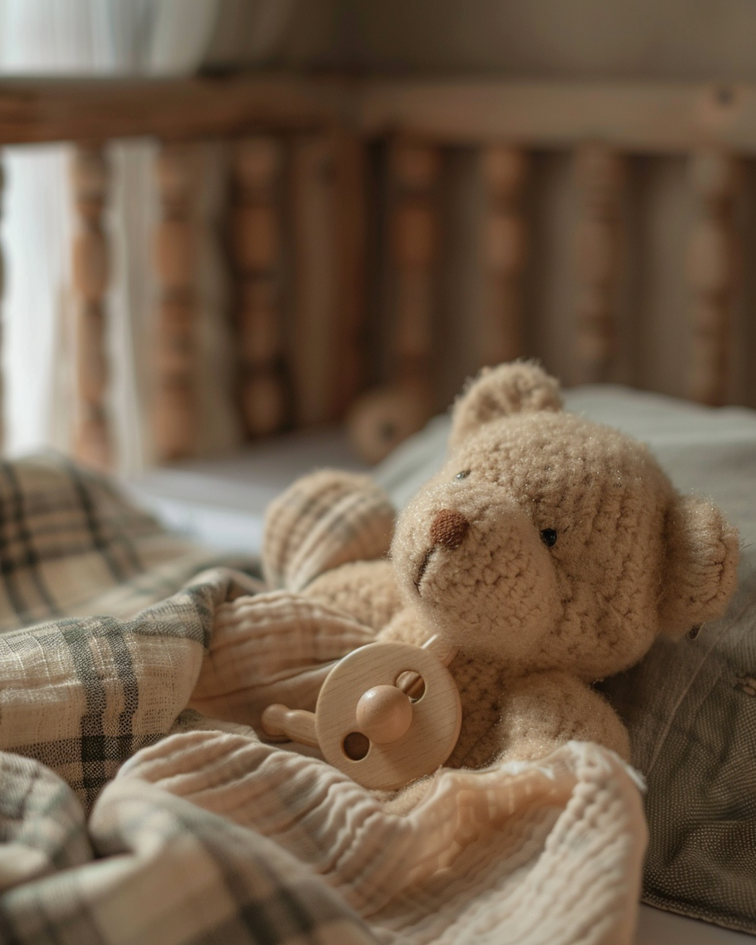 Cozy teddy bear with a wooden rattle in a nursery setting, surrounded by soft plaid blankets and a wooden crib.